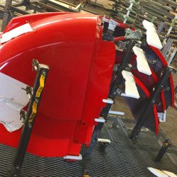Lui è Fender, trasporta i grossi parafanchi rosso ferrari dei trattori della linea New Holland Group.